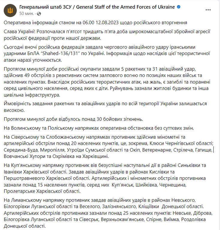 Сьогодні вже розпочалася 535 доба повномасштабного вторгнення РФ проти України. Впродовж минулої доби російські окупанти завдали 5 ракетних та 31 авіаційний удар по Україні.