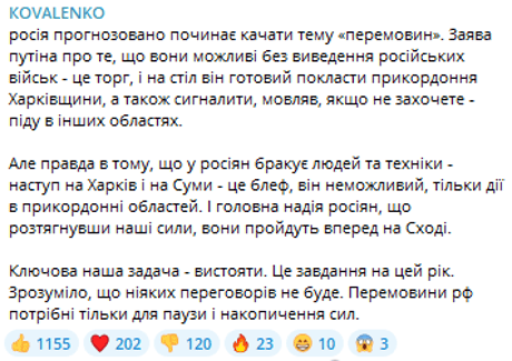 За словами Коваленка, Росія маніпулює ідеєю "перемовин" лише для того, щоб здобути паузу у війні та накопичити сили. Заява російського диктатора про готовність до переговорів звучить як спроба вибрати найвигідніший момент для себе, приховуючи істинні мотиви та інтереси.