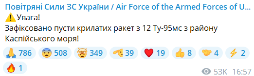 "Увага! Зафіксовано пуски крилатих ракет з 12 Ту-95мс з району Каспійського моря", — йдеться у повідомленні.