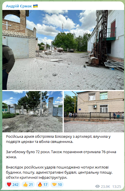 Російські окупаційні війська завдали масованого удару по Білозерці в Херсонській області. Внаслідок удару по церкві загинув священник, ще одна людина була поранена.