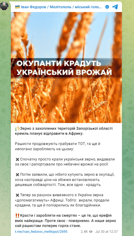 "Спочатку просто крали українське зерно, видавали за своє і рапортували про небачені врожаї на Росії. Потім заявили, що нібито купують зерно в окупації, хоча насправді ціни на збіжжя встановлюють дешевше собівартості. Тож, все одно — крадуть", — написав він.