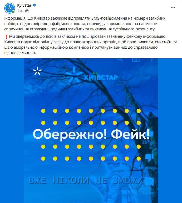 "Інформація, що Київстар закликає відправляти SMS-повідомлення на номери загиблих воїнів, є неправдивою, сфабрикованою та, вочевидь, спрямованою на навмисне спричинення страждань родичам загиблих та викликання суспільного резонансу", — пояснили в компанії.