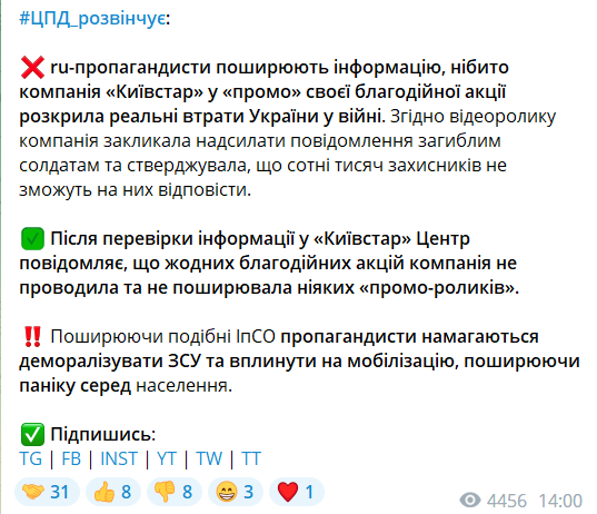 "Ru-пропагандисти поширюють інформацію, нібито компанія "Київстар" у "промо" своєї благодійної акції розкрила реальні втрати України у війні. Згідно з відеороликом, компанія закликала надсилати повідомлення загиблим солдатам та стверджувала, що сотні тисяч захисників не зможуть на них відповісти", — зазначили в ЦПД.