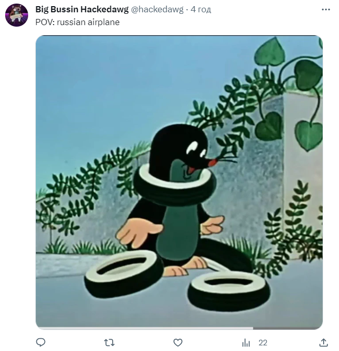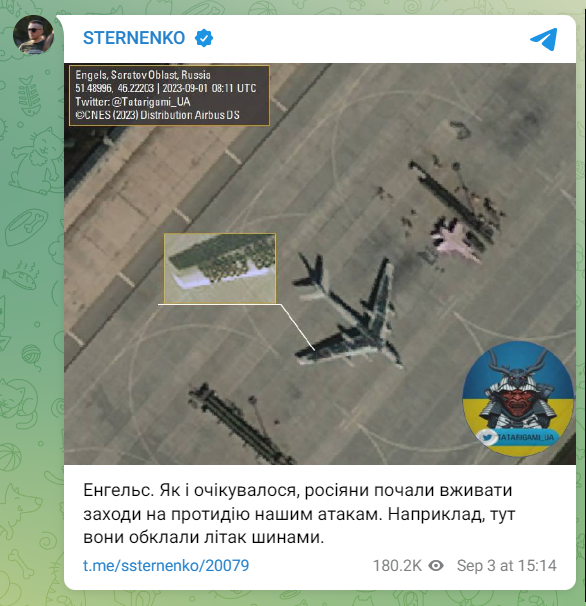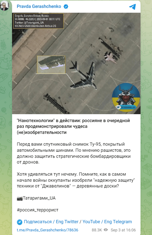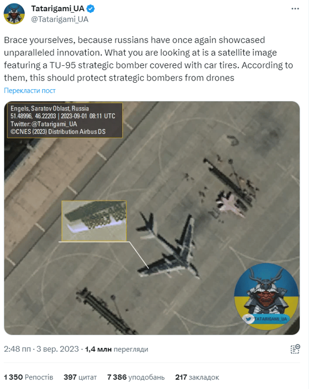 "Будьте готові, адже росіяни знову продемонстрували неперевершені інновації. Ви бачите супутникове зображення стратегічного бомбардувальника ТУ-95, покритого автомобільними шинами. За їхніми словами, це має захистити стратегічні бомбардувальники від безпілотників", — написав він.
