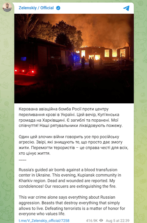"Керована авіаційна бомба Росії проти центру переливання крові в Україні. Цей вечір, Купʼянська громада на Харківщині. Є загиблі та поранені. Мої співчуття! Наші рятувальники ліквідовують пожежу. Один цей злочин війни говорить усе про російську агресію. Звірі, які знищують те, що просто дає змогу жити. Перемогти терористів — це справа честі для всіх, хто цінує життя", — наголосив глава держави.