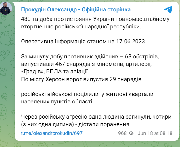 Минулої доби російські окупанти 68 разів обстріляли Херсонську область. Ворог випустив 467 снарядів з мінометів, артилерії, "Градів", БПЛА та авіації.