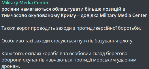 "Росіяни намагаються облаштувати більше позицій в тимчасово окупованому Криму. Також ворог проводить заходи з протидиверсійної боротьби. Особливо такі заходи стосуються пунктів базування флоту", — йдеться в повідомленні.