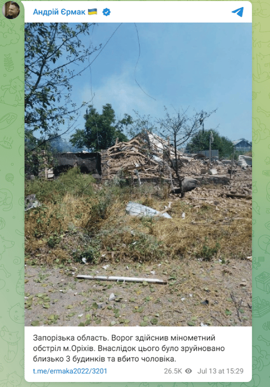 Росіяни вчергове обстріляли Оріхів: є загиблий
