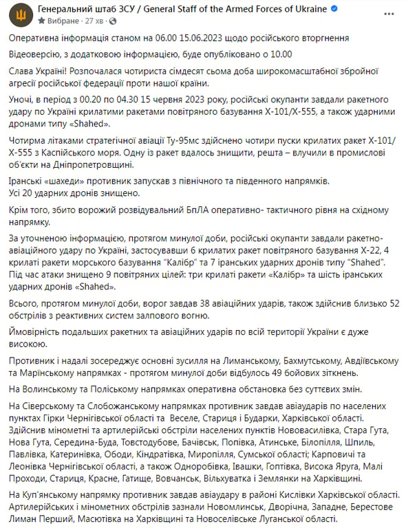 За інформацією Генштабу, російські окупанти за минулу добу 38 разів завдали ударів по позиціях українських військ та населених пунктах України за допомогою авіації.