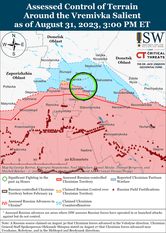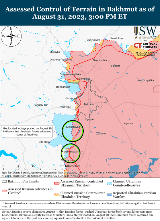 В Институте изучения войны (ISW) отмечают, что на 01.09.2023 ВСУ продолжили контрнаступательные операции вблизи Бахмута Донецкой области и на западе Запорожской области.