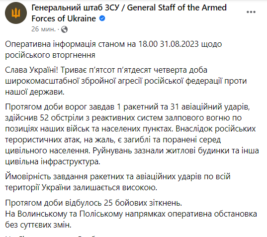 Актуальное возведение Генштаба ВСУ на 1 сентября 2023 следует ожидать позже, около 6:30 утра. Вечерний отчет по состоянию на 31.08.2023: