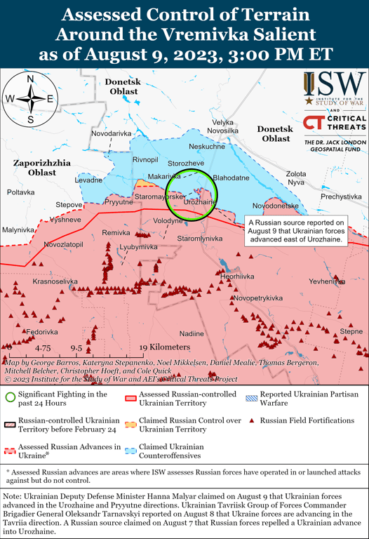 Генштаб ВСУ сообщил, что украинские силы отразили российские атаки в окрестностях Клещеевки, к северо-востоку от Дружбы (20 км к юго-западу от Бахмута) и вблизи Зайцева (21 км к югу от Бахмута), а Маляр добавила, что российские силы последовательно контратакуют на этих направлениях.