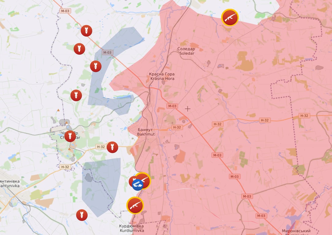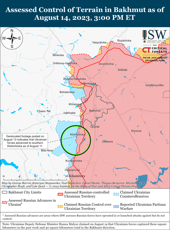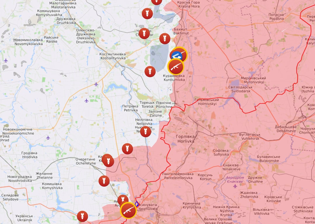 В Институте изучения войны (ISW) отмечают, что украинские силы имеют успехи на Бахмутском направлении. Так, ВСУ совершили незначительное продвижение к югу от Клещеевки (7 км юго-западнее Бахмута), атакуя позиции россиян.