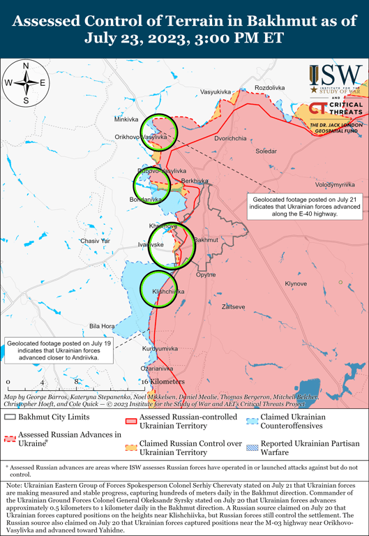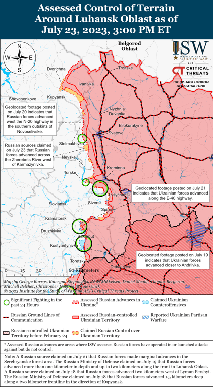 Украинские силы продолжали контрнаступательную операцию в районе Бахмута и, как сообщается, 23 июля добились успехов вблизи города Бахмут. Украинский источник сообщил, что украинские силы продвинулись северо-западнее Хромового (непосредственно западнее Бахмута), а российский милблогер утверждал, что украинские силы оттеснили российские войска к городской черте населенного пункта.