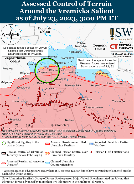 Украинские войска продолжали наступательные операции вдоль западной границы Донецкой и Восточной Запорожской областей и продвигались по состоянию на 23 июля. Геолокационные кадры, опубликованные 22 июля, показывают, что украинские войска вошли в северное Старомайорское (9 км к югу от Великой Новоселки), хотя масштаб нынешних украинских позиций в населенном пункте или вблизи него неизвестен.