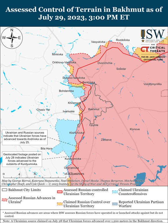 В Институте изучения войны (ISW) отмечают, что украинские войска продолжали контрнаступательные действия на Бахмутском направлении и продвинулись вперед к северо-западной окраине Курдюмовки (11 км к юго-западу от Бахмута).