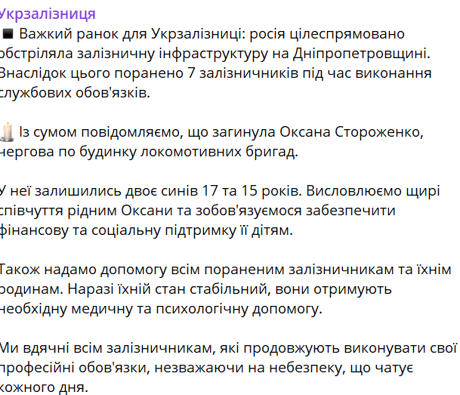 Из-за российского обстрела Днепропетровщины погибла работница Укрзализныци, еще семь — ранены