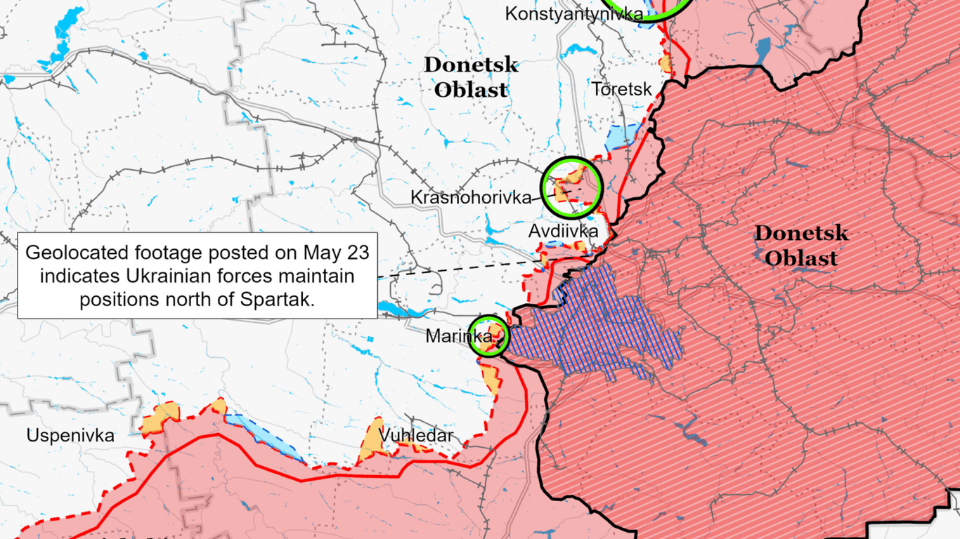 Отмечается, что за минувшие сутки, 26 мая, российские войска продлили ограниченные наступательные действия на участке фронта Авдеевка-Донецк. По данным Генштаба, российские войска вели безуспешные наступательные действия вблизи Красногоровки (неизвестно, северо-юго-западнее Авдеевки — Красногоровка) и Марьинки (27 км юго-западнее Авдеевки).