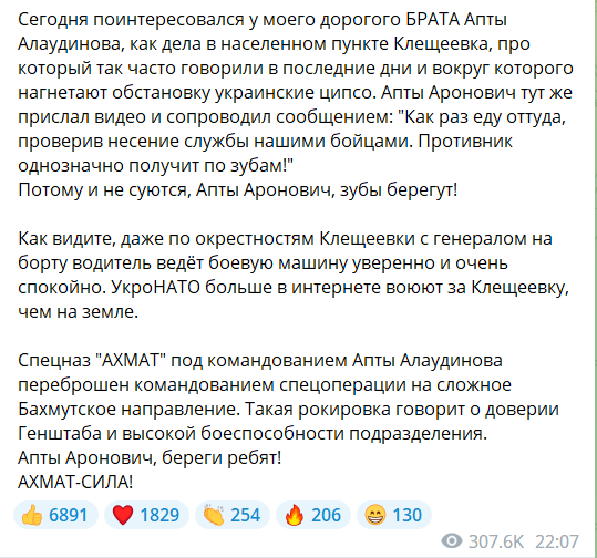 "Спецназ "Ахмат" под командованием Апты Алаудинова перекинут командованием спецопераций на сложное бахмутское направление. Такая рокировка говорит о доверии Генштаба и высокой боеспособности подразделения", — заявил лидер Чечни.