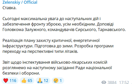 Прежде всего, по словам Зеленского, собравшиеся обсудили наступательные действия ВСУ, обеспечение украинских защитников оружием и всем необходимым. По этому поводу выступили с докладами: главнокомандующий Валерий Залужный, командующие Александр Сырский и Александр Тарнавский.