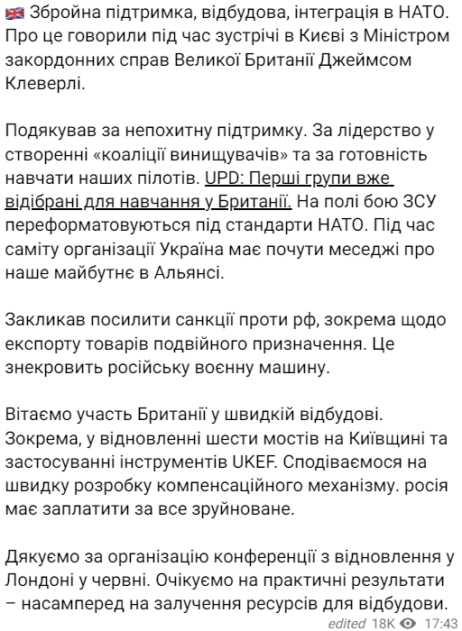 Об этом он рассказал после встречи с министром иностранных дел Британии Джеймсом Клэверли. Лидеры говорили о вооруженной поддержке, восстановлении страны и интеграции в НАТО. В частности, Шмыгаль поблагодарил за поддержку и "готовность учить наших пилотов".