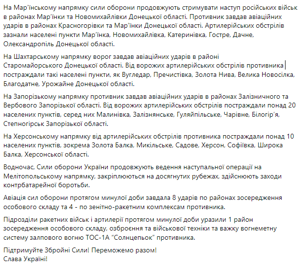 Силы обороны Украины продолжают сдерживать наступление россиян в районах Марьинки и Новомихайловки Донецкой области. Также оккупанты обстреливали населенные пункты региона из разных видов оружия.