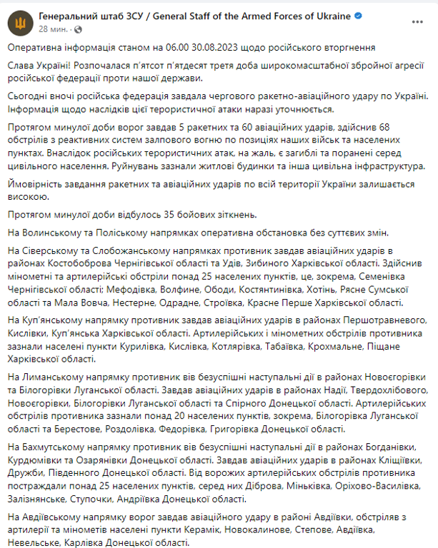 В Генштабе рассказали о ситуации по направлениям фронта по состоянию на 30 августа.