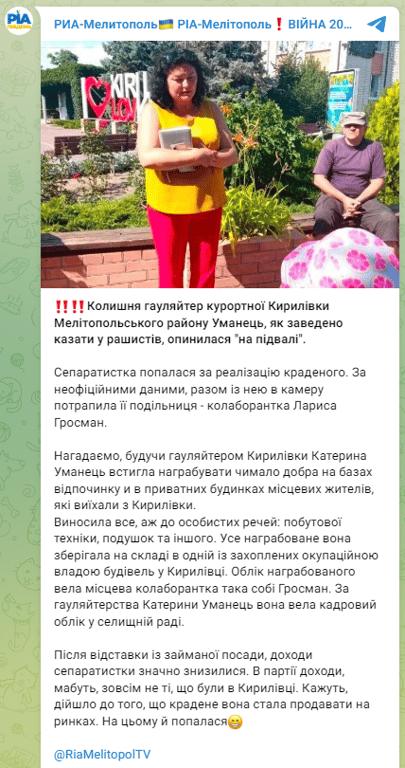 "Будучи гауляйтером Кирилловки, Екатерина Уманец успела награбить немало добра на базах отдыха и в частных домах выехавших из Кирилловки местных жителей. Выносила все, вплоть до личных вещей: бытовой техники, подушек и прочего", — говорится в сообщении.