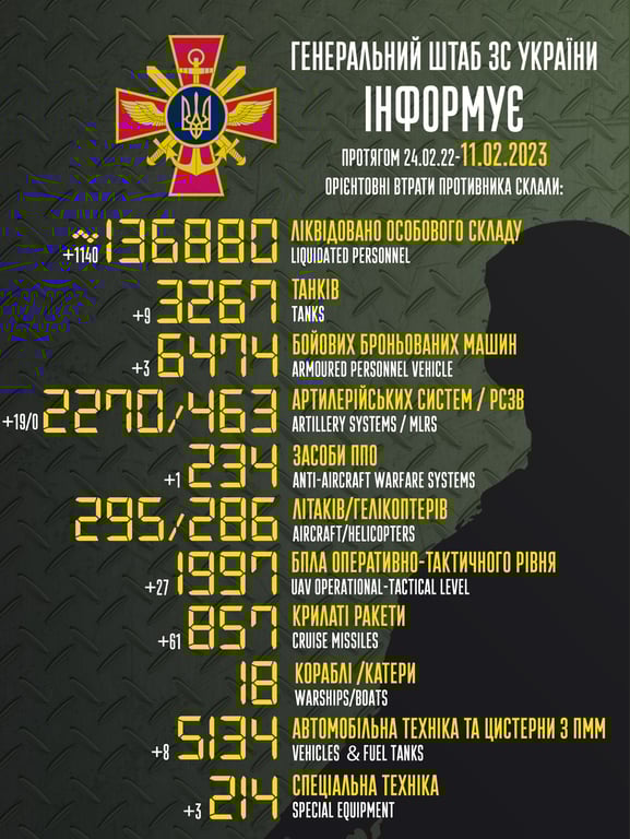 За 10 февраля украинские защитники уничтожили на фронтах войны более 1100 российских оккупантов.