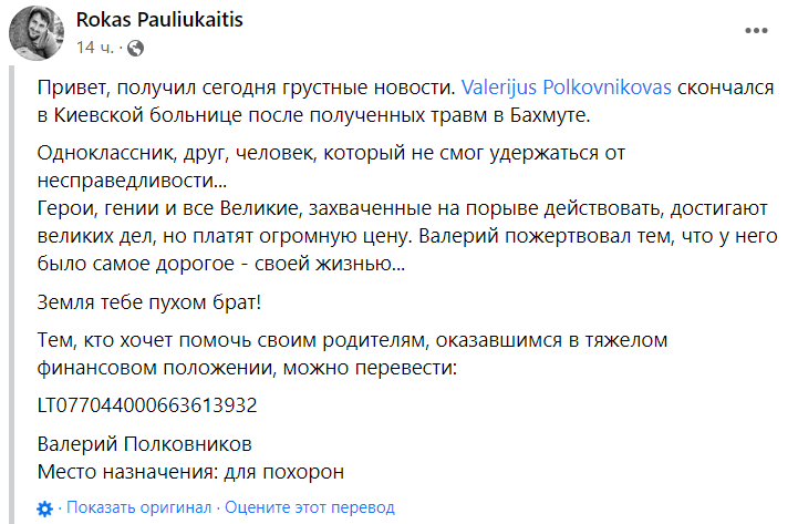 "Сегодня я получил печальное известие. В киевской больнице от полученных в Бахмуте ранений умер Валериус Полковниковас. Одноклассник, друг, человек, который не мог оставаться в стороне, когда видел несправедливость", — написал он.