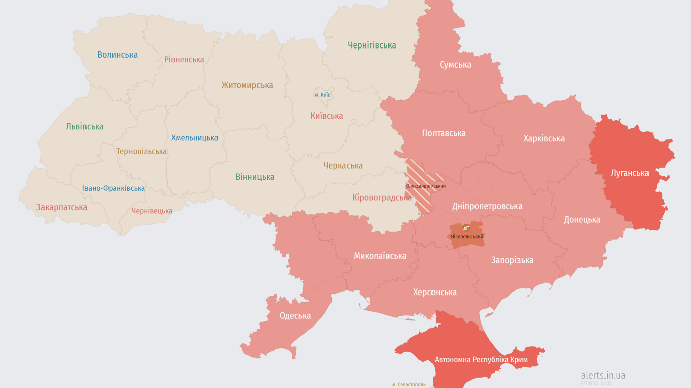 Карта Украины ночью, 7 сентября, снова "краснеет". Воздушная тревога, начавшаяся около 01:00, была объявлена в большинстве областях. Есть угроза удара БпЛА и применения баллистики.