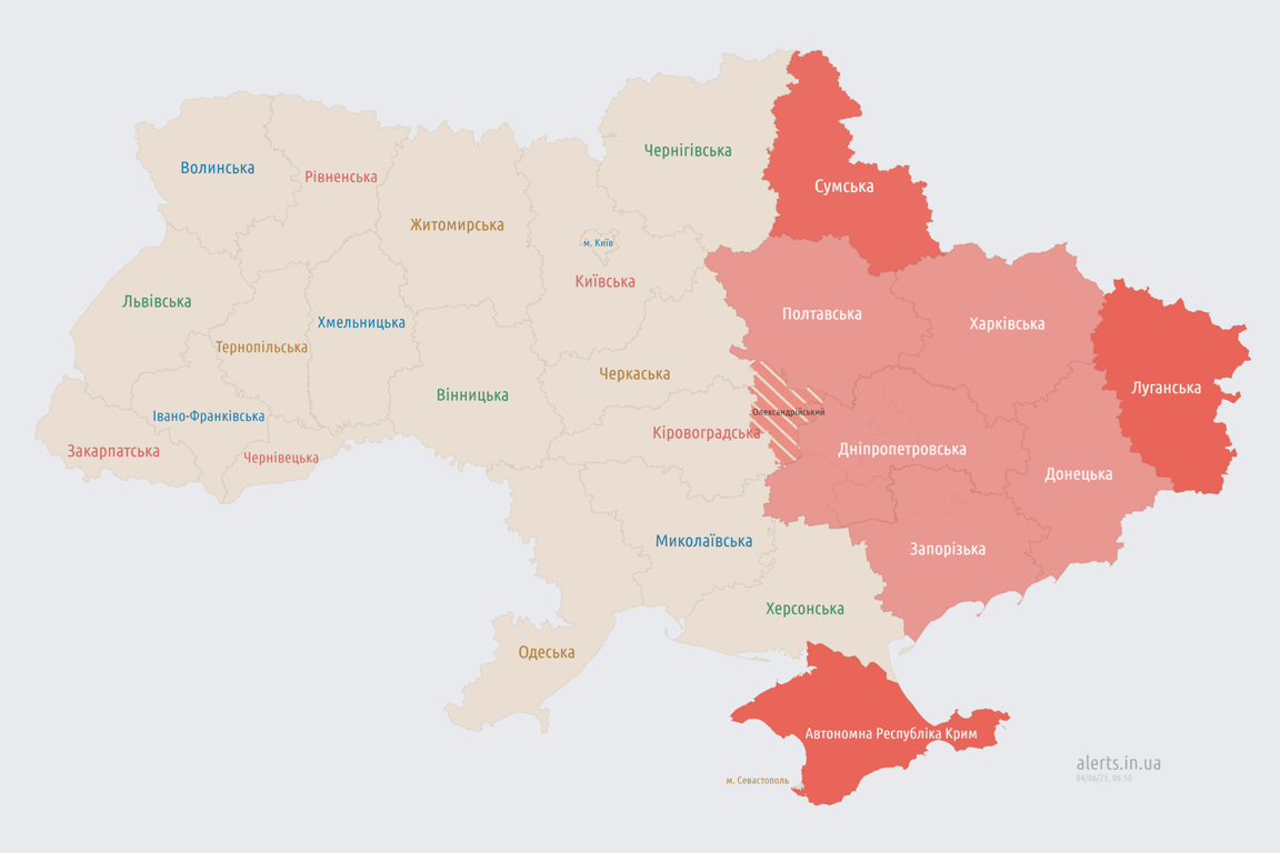 Обновлено 06:50. Воздушная тревога в ряде областей, а именно Сумской, Полтавской, Харьковской, Днепропетровской, Донецкой и Запорожской. Также существует угроза в Александровском районе Кировоградской области.