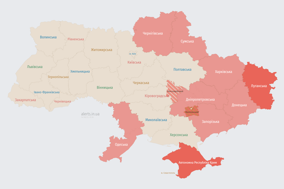 Ночью, 14 августа, значительная часть областей Украины "покраснела". Воздушная тревога объявлена из-за угрозы баллистики.