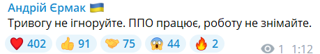 Глава Офиса Президента Андрей Ермак сообщает о работе ПВО и призывает не снимать работу украинских защитников и сидеть в укрытии.