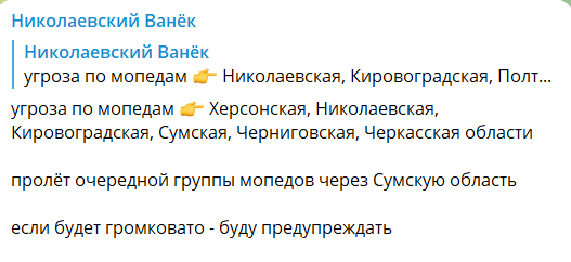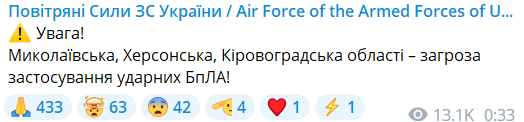 Обновлено 00:36. "Николаевская, Херсонская, Кировоградская области — угроза применения ударных БпЛА!" — Сообщают Воздушные силы.