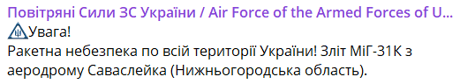 Украиной снова распространяется воздушная тревога. С аэродрома "Саваслейка" в четвертый раз взлетел истребитель-перехватчик МиГ-31.