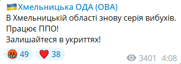 Обновлено 04:10. "В Хмельницкой области снова серия взрывов. Работает ПВО", — сообщают в Хмельницкой ОВА.