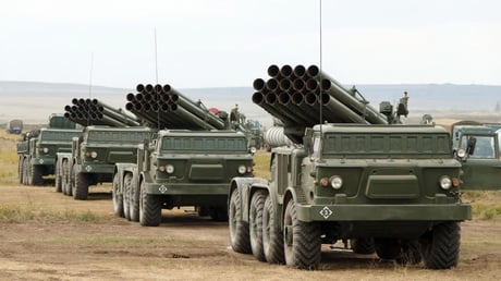 Советская российская 220-мм реактивная система залпового огня БМ-27 "Ураган".