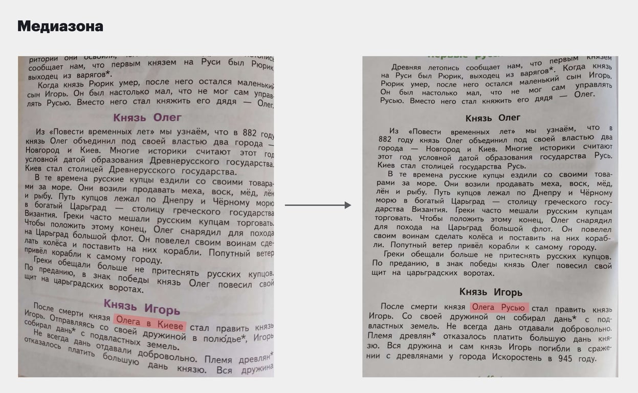 Также в старой версии было отмечено, что князь Владимир крестил весь народ в Киеве, а по новой версии учебника просто — в столице. И третье: было "После смерти Олега в Киеве стал править князь Игорь", а стало — "После смерти Олега Русью стал править князь Игорь".