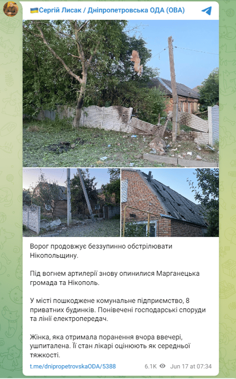 По словам Лысака, под огнем российской артиллерии находились Марганецкая община и Никополь.