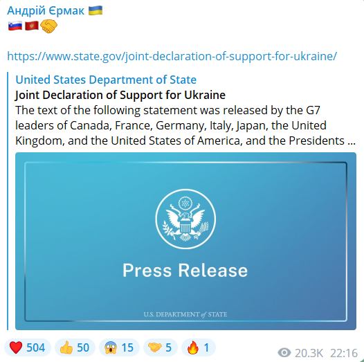 Глава Офиса Президента Украины Андрей Ермак с помощью эмодзи рассказал, что еще две страны присоединились к декларации G7 о гарантиях безопасности нашего государства. Этими странами являются Словения и Черногория.