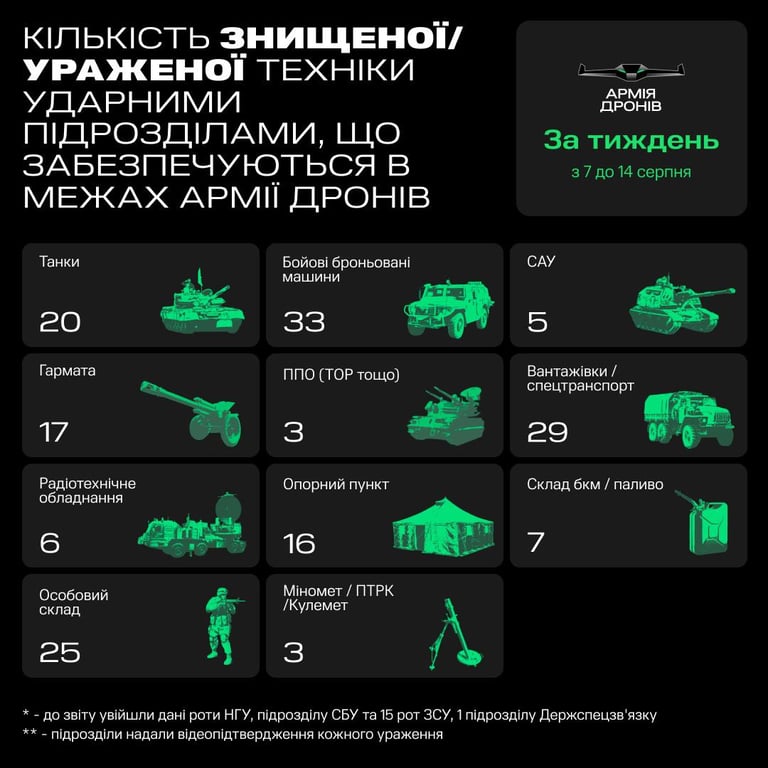"На этой неделе операторы Армии дронов поразили 33 бронированных машины, 29 грузовиков, 20 танков и многое другое имущество РФ. Все детали смотрите на инфографике", — сообщил Федоров.