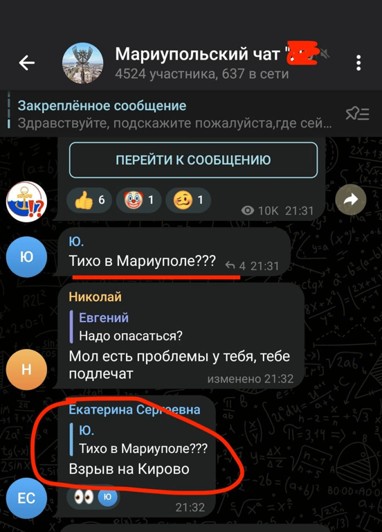 Одну из таких переписок обнародовал советник мэра Мариуполя Петр Андрющенко. В нем жители обсуждают странные звуки, но пропагандисты говорят о работе ПВО.