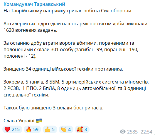 "За последние сутки потери врага убитыми, ранеными и пленными составили 301 человек (погибшие — 99, раненые — 190, пленные — 12)", — говорится в сообщении.