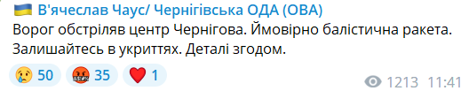 Информацию о взрыве в Чернигове подтвердил глава Черниговской ОВ Вячеслав Чаус. По его словам, предварительно известно, что по центру города враг нанес удар баллистической ракетой.