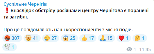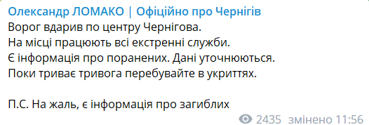 "Враг ударил по центру Чернигова. На месте работают все экстренные службы. Есть информация о раненых. Данные уточняются. Пока продолжается тревога, находитесь в укрытиях. К сожалению, есть информация о погибших", — написал он в своем Telegram.