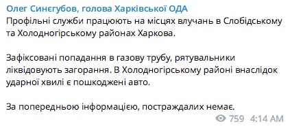 Обновлено 04:35. Глава Харьковской ОВА Олег Синегубов сообщил, что оккупанты выпустили по меньшей мере три ракеты по городу.
