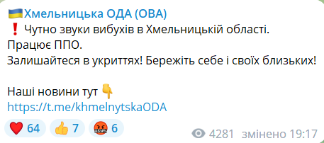 19:17 Хмельницкая ОВА сообщила, что звуки взрывов в регионе связаны с работой ПВО.