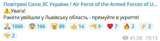 19:13 Воздушные силы сообщают, что ракеты вошли во Львовскую область.