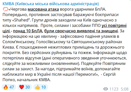 "По информации на эту минуту — зафиксировано падение обломков в Соломенском, Голосеевском и Святошинском районах Киева. Есть повреждения нежилых помещений и дорожного покрытия. Без серьезных разрушений и пожаров. Информация о пострадавших отсутствует", — говорится в сообщении.